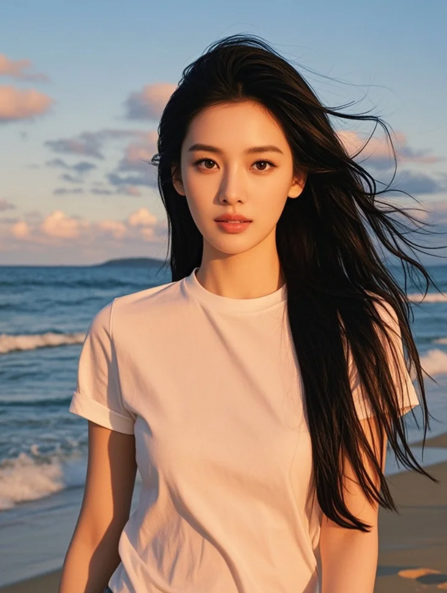 蓝天为幕,白云作伴,她身着简约T恤,以亲和笑容点亮了整片金色海岸线