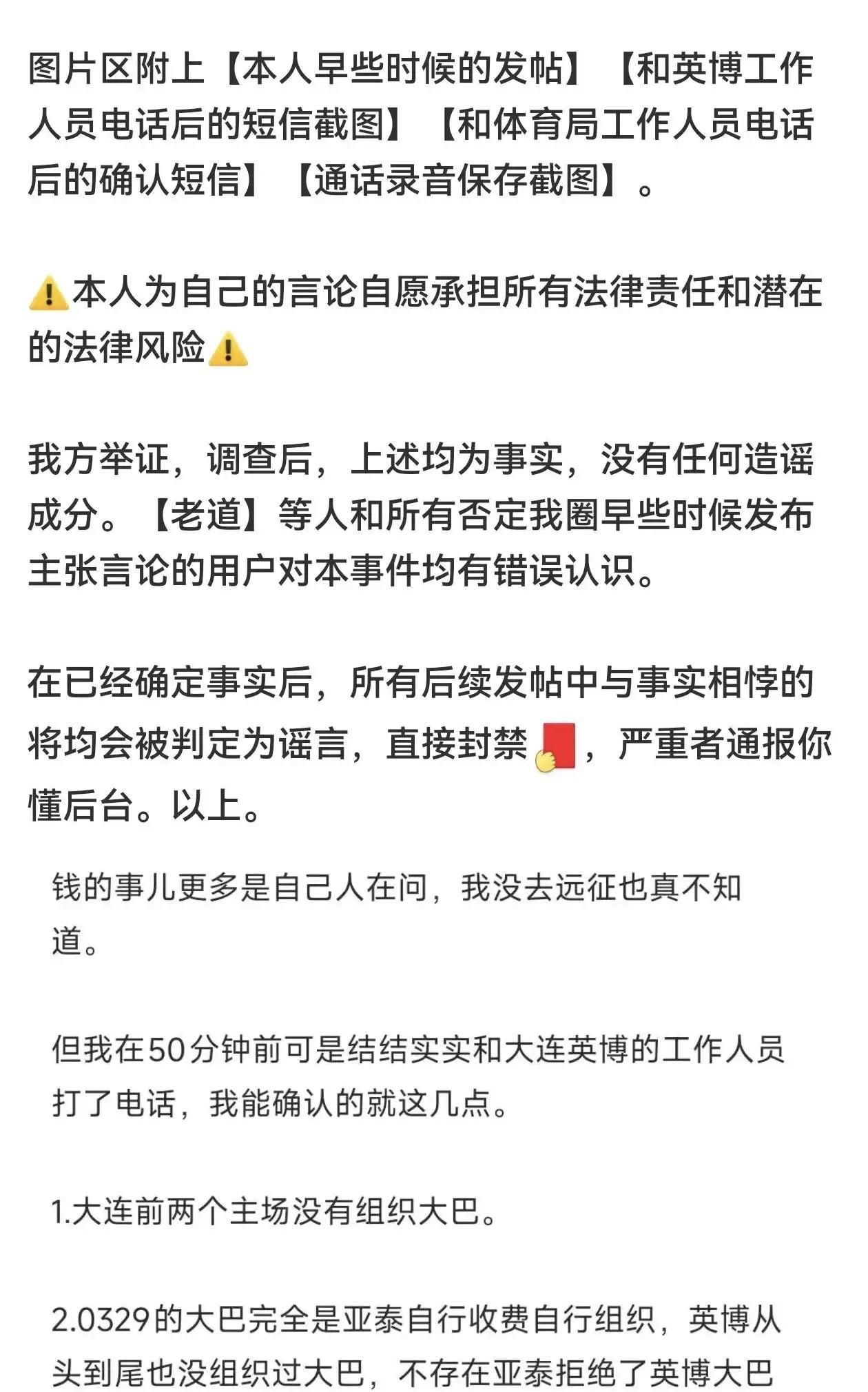 听到大连英博球迷口口声声为亚泰远征军提供了免费接送车辆、并要求待遇对等的喊话后,3月29日参与了远征的亚泰球迷一听就炸了,明明我们自己交了每人17元租车费用,而大连那边却说是免费,于是纷纷质询球会的带头大哥给出解释?大哥一听更加委屈,明明都将租车费转账给了大连的租车公司,路线和助威装备都报备给了赛区安保,还要被怀疑中饱私囊,这不是费力不讨好吗? 实际情况是,大连英博主场从联赛第三轮开始才为客队球迷提供免费接送,而对阵亚泰的比赛是首轮主场比赛,提供了1000张限额客队门票,并要求身份证21开头的慎重报名,并未提供免费接送。