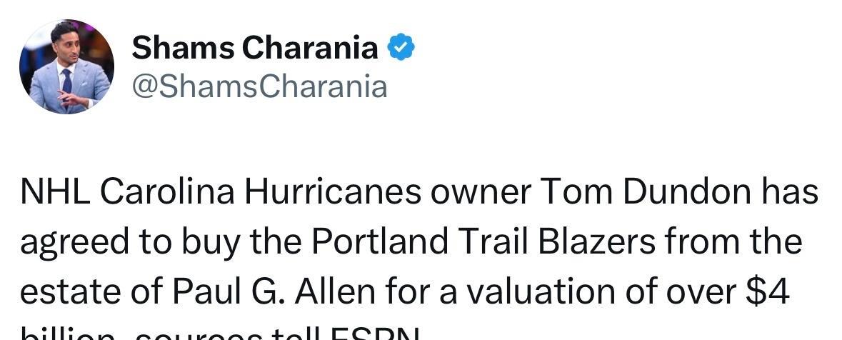 开拓者以超过40亿的价格卖掉了球队! 据shams报道,汤姆邓登已同意收购波特兰