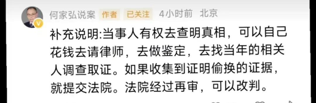 柴桑在直播中说了大实话,52万的会什么时候开,还不明白吗?她自己都昭告天下了。 老杜说了,我又没有鼓动人,我不去开会我也会赢。我何必去花钱去开会?本来熊磊和老郭也不想去,为了去发声表达自己的观点才去的。 这是老杜说的三拒绝,52万熊磊信誓旦旦说没有,至于什么时候开会,柴桑也不正面回答了。 关键时刻法律泰斗何家弘在网络留言,当事人有权去查明真相,可以自己花钱去请律师,去做鉴定,去找当年相关人调查取证。如果收集到证明偷换的证据,可以提交法院,法院经过再审,可以改判。 何教授一句话点破天机,不用绕那么多弯子,不用天天在网上直播说案,现在关键的重点是要收集证明偷换的证据。 现在什么谢律、王律的都集体发声力挺许姚,还有原有律师李圣,这么多的律师完全可以收集到偷换的证据,不用舍近求远搞什么三拒绝、52万了。