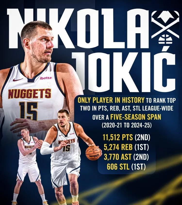 约基奇退役后历史地位能有多高?能进入历史前五吗? 今天,掘金官方晒出了约基奇近5个赛季的数据,总得分、总篮板、总助攻以及总抢断均排在联盟前2名! 这个数据太夸张了吧! 得分、篮板、助攻联盟前二可以理解,没想到的是这么一个大个子,总抢断居然也是全联盟第1,这也太全能了吧。也足以说明约基奇的球高之高! 下赛季约基奇仍是当打之年,作为一个二轮秀,现役联盟第1人,现在唯一缺的就是总冠军数量。若约基奇不管用什么方法,抱团也好,若再拿2冠以上,其退役后历史地位应该可以进入历史前5吧! #约基奇#