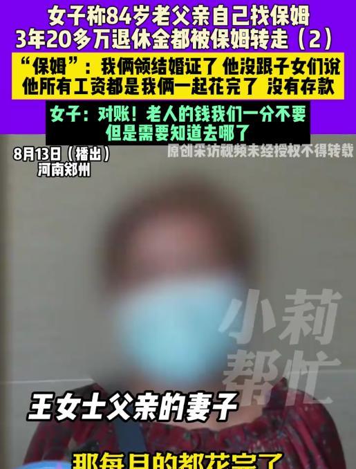 万万没想到!河南郑州,84岁老人生病住院,医院多次通知缴费,儿女们想着父亲每月有八千退休金,结果一查,余额只剩149元,怀疑是保姆偷偷挪用了,可万万没想到,保姆却拿出一张结婚证,原来两人竟然偷偷结了婚 王大爷原本和老伴育有四个子女,老伴去世后,他轮流在子女家居住。三年前,老人提出要独自生活,子女们虽然同意,但坚持要为他请保姆 没想到老人自己找了个70多岁的保姆,更让人意外的是,两人在2022年就悄悄领了结婚证,子女们对此毫不知情 这次老人住院20多天,女儿王女士去银行取钱时才发现,父亲三年来的退休金几乎所剩无几。面对质疑,保姆阿姨不慌不忙地掏出了结婚证,证明他们是合法夫妻 保姆承认,工资卡在她手里,钱每月取出来花了,但都是夫妻共同花费,并没有给别人。她列出花销——家电、暖气管道、空气净化器、保健品……单件就几千块 但王女士还是觉得不合理,毕竟这些大件也不是每个月都买,而保姆表示这些都有记账,可以慢慢查 这里面有一个关键点值得思考。老人再婚并不违法,哪怕和保姆结婚也没问题。但问题是,婚姻的隐瞒、财产的使用方式,会让子女质疑对方是否出于感情还是为了钱 我觉得,像这种情况,财务透明都很重要,结婚也好、找保姆也好,最好提前和子女沟通清楚 对于子女来说,也别等到钱花光、人生病才介入,平时多问一句,关心一下