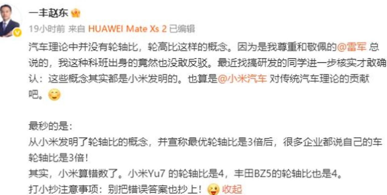近日,一汽丰田赵东发文质疑小米 YU7 的 “轮轴比” 说法。他指出小米宣称的 3 倍轮轴比实际应为 4 倍,且 “轮轴比”“轮高比” 是其自创概念,非传统汽车理论所有,甚至引发了部分企业跟风抄错。 事实上,小米类似营销争议早有先例,如笔记本厚度、手机对比等。其造车后也常因一些概念营销而出圈,如车规级纸巾盒等,虽带火一些功能,但也引发了不小争议。