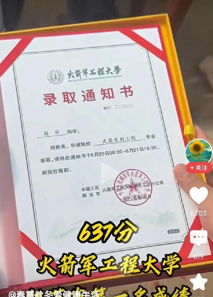寒门出贵子,农村娃被火箭军工程大学录取。没想到录取分数那么高,他考了637分。上这个学校算不算军校,毕业了是不是一名军人,逆天改命。看身后他妈妈一脸的骄傲,为她的儿子能够成为军人,研究火箭高兴。看他妈妈穿戴,也是一名贫苦农民,培养出来这样大学生也是不容易。 不知道这个学校和国防大学哪个更厉害。
