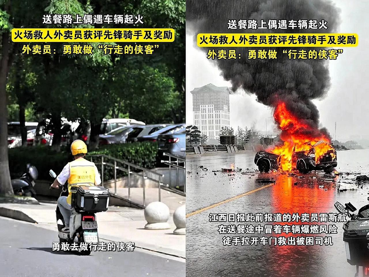 “胆子太大了!”近日,江西南昌,一外卖小哥正在送餐,路边一辆汽车竟突然起火,司机被困! 围观的人都捏着把汗,谁都知道这时候靠近就是玩命。可雷斯航停下车就冲了过去,没工具就用手掰变形的车门,铁皮划得手心冒血,他甩甩手上的汗和血,接着跟死神抢时间! 就在火苗窜起来的前几秒,他把昏迷的司机拖了出来,转身骑上小电驴继续送餐,好像刚才只是帮人捡了个外卖! 这哪是什么"应该的"?分明是刻在骨子里的热肠。那些穿着工作服奔波的人,藏着多少不为人知的勇敢!