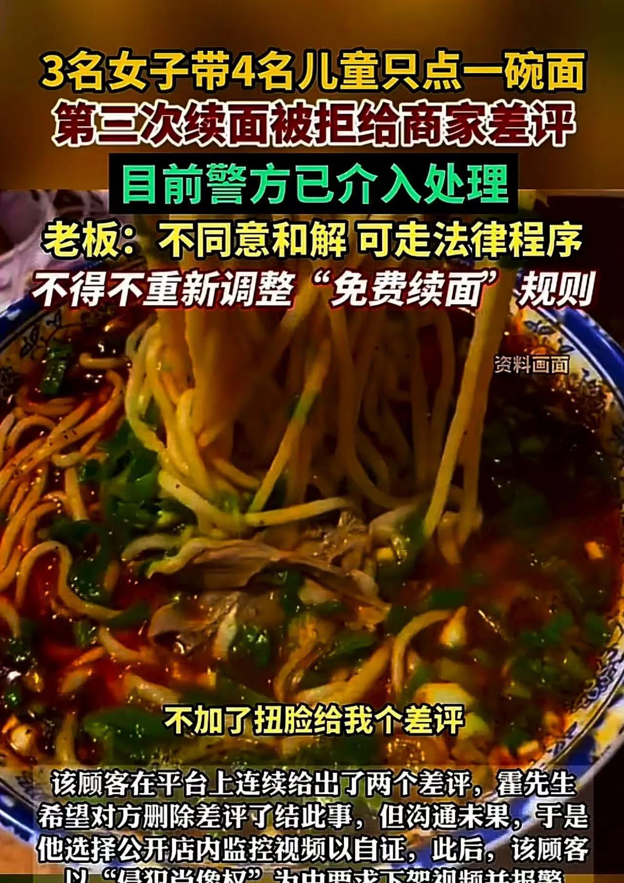 3名女子带4名儿童只点一碗面,第三次续面被老板拒绝,女子气得给店家2个差评!女子:“我只往一个碗里加面,不是同时往7个碗里加面。你既然承诺免费加面,就得兑现!”商家怒扇视频,让大家评评理,女子选择报案! (来源:湖北日报) 老板霍先生称,店里确实有免费续面,目的是为了让饭量大的人能吃饱,传递一份餐饮行业的温暖与善意。 可是当天晚上7点多,3名成年女子带着4名儿童只点了一碗面。 第一次加面,霍先生给加了,第二次女子拿碗来加,霍老板也忍了,又给女子续满。 可第三次女子来续时,霍先生实在忍不了 ,拒绝加面。 霍老板认为女子只点一碗面,想让7人吃饱,明显是借规则漏洞占便宜。 而女子则坚持,既然承诺免费续面且未明确限制人数,商家就该无条件兑现。 双方争执不下,女子反手在平台连刷两条差评;霍先生为证清白公开监控,却遭女子以侵犯肖像权为由报警。 目前警方已介入,但双方仍未达成和解。 霍先生态度坚决:“我是不同意和解,如果对方坚持,会走法律程序。另外,我将不得不重新调整免费续面的规则,带孩子的顾客如果觉得面不够吃,需要加面时就必须单独付费购买。” 此事引发了热议,有网友说,这老板没有一点点格局!我一碗面想怎么吃就怎么吃,哪怕我拿去喂猪,面没了,也得给我续,因为规则是你定的,觉得吃亏可以等这个顾客走了再改规则! 也有网友说,免费续面的情况是,只要是你自己吃,你吃10碗我也让你续,直到你吃饱。你点一碗面一家人吃饱,哪个冤大头受得了你? 还有网友说,七个人点了一碗面,加了两次面,再给老板差评,也太不厚道了,生活不易,面店老板也同样不易。 "免费续面"本是商家与顾客间的温暖约定,承载着对食客的体谅与善意。 但若有人将其异化为"一人点单、全家饱腹"的薅羊毛工具,不仅透支了商家的善意,更会迫使规则收紧,最终让所有诚实守规的消费者为少数人的贪婪买单。 当然,老板有必要针对规则说的更清楚一点,但比规则更重要的,是藏在人性里的分寸感——商家让利是情分,消费者适可而止是本分,否则当善意被过度消费,最终寒的将是整个社会的温度。#头号创作者激励计划#