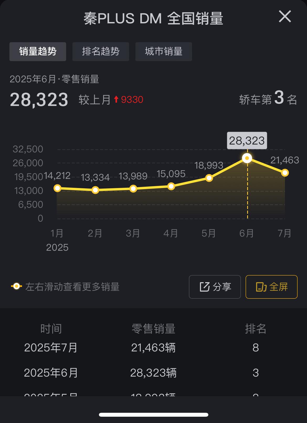 当前形势:许多买车的朋友都会觉得销量对购车影响挺大的,其实这样的参考也没错,就是现在的网络太过于达到,有些信息可真可假,导致我们有些迷茫。 🤔️个人观点:销量作为一个数据,对于买车看销量有一定参考价值,毕竟选择的人多了,肯定有一定的原因,毕竟群众的眼睛是雪亮的!但是吧,也不能完全迷信,现在的车商品牌各种竞争,无所不用其极,但有时候销量多也不一定是真的。 👉🏻基本情況:本人在21年购入比亚迪秦 plusdmi, 作为首批 dmi车主,当时这部车站在风口浪尖上,大家对它褒贬不一,接下来结合我购买比亚迪秦PLUS的经历或许来谈谈这个话题。 ✅看车🉐️看销量: 原因1⃣️:销量是重要指标之一。当初选车时,秦PLUS的高销量是重要吸引力。它发售之后便长期稳居插混车型销量前列,这背后不仅仅是市场对其产品力的认可,另外我看重的低油耗,日常通勤纯电模式足够用,长途用油也毫无压力,百公里综合油耗低至3,8L,对家用来说太友好了,车辆定位基本满足广大群众需要。 原因2⃣️:销量高有好处。卖的多了,出问题故障,维修的时候也维修方便,全国网点多,配件供应充足,不用担心后期保养麻烦,而且啊,销量背后往往是厂家对产品的持续优化,比如秦PLUS这两年在车机系统、车辆座椅,智能驾驶方面升级,让更多的人愿意尝试国产新能源汽车。 ❌看车不怎么看销量: 原因1⃣️:销量也不能代替所有,这销量也不能作为唯一标淮,不论什么样的车,销量多不代表适合你,我们买车也要靠白身需求,根据自身需要,考虑用车场景,实际情况等等。适合自己的,才是最好的。 原因2⃣️:有时候销量也有虚假的数据,另外不排除许多人跟风购买,只有实际驾驶检验车辆才是真实的数据。 📈❤️总结:总的来说,销量是市场上人们选择的投票的结果,能帮我们过滤掉一些不靠谱的选项,让我们的选择简单化,并且有很多车主给出建议可以采纳,多听听也没错,但是也不能全部依靠听,最终还要结合自己的用车场景、预算和偏好。 就像我选秦PLUS,既参考了它的高销量所体现的可靠性,也确认了它的低油耗、性价比符合我的家用需求,加上当时就想试试国产新能源汽车,在这样情况下,最终做了选择,现在也基本能满意。 兄弟们,你们说呢?