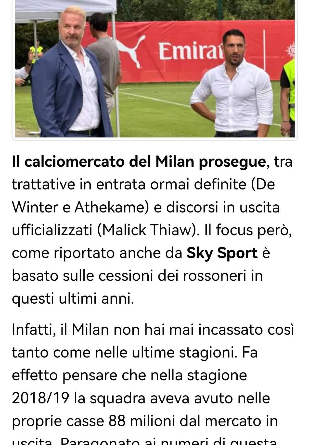 MN:米兰本赛季转会收入比近3个赛季总和还要多,转会还未结束已入账1.49亿欧 米兰的转会市场仍在继续,既有已敲定的引进交易(德温特和阿特卡梅),也有官方宣布的离队消息(马利克·佳夫)。不过,正如天空体育所报道的,焦点集中在红黑军团近几个赛季的球员出售上。 事实上,米兰从未像最近几个赛季那样通过转会赚得如此之多。想想2018/19赛季,球队从转会市场的出售中仅入账8800万欧元,而与今年夏窗的数字相比,差距巨大。 今年夏天尚未结束,米兰目前已入账1.49亿欧元。这一数字与2019/20赛季(5900万欧元)、2020/21赛季(5100万欧元),以及最近的意甲冠军赛季2022/23赛季(仅入账1100万欧元)相比,有着天壤之别。