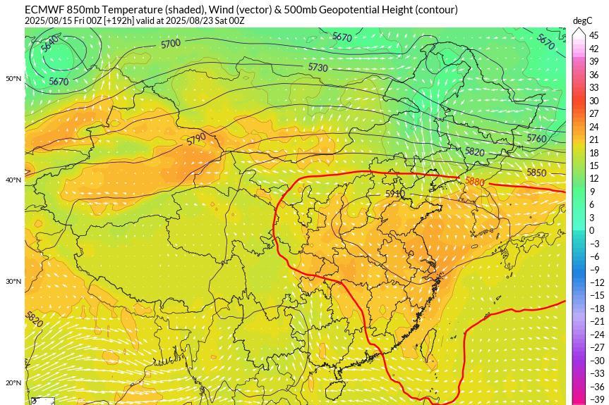 从最新的数值预报来看,本轮高温的持续时间会比较久,一直到25号副高依旧非常强大,588位势区将控制我国中东部的大部地区,591位势区也牢牢控制着黄淮、江淮、江汉等地,黄河以南大部地区都将以闷热的桑拿天为主。不过目前看23号前后北方有一股冷空气渗透南下,有望在底层击穿北方的副高,让华北大部、黄淮中北部气温出现明显下降,结束高温。而南方的副高依然还是铁桶一个,如果没有明显台风影响,高温怕是要持续到9月了。