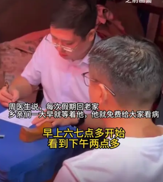 “上人民日报了!”河南济源,一90后中医博士后暑假回老家后,每天早上六七点就出来摆摊,免费帮村民们把脉看病,一直到下午两点多才结束,中午忙得连饭都来不及吃,10年来寒来暑往、雨打风吹,从未间断过!该医生表示:只要大家有需要,就会一直做下去。 最近,河南济源村口一个“特殊摊位”突然火上人民日报,没有霓虹灯招牌,就一张旧木桌、一个布脉枕,却让乡亲们搬着板凳追了整整十年。 主角是90后周荣易,河南中医药大学第一附属医院儿科副主任医师,还是中医博士后。 可每到寒暑假,他就成了老家村口最忙的“摆摊大夫”:天刚蒙蒙亮,六七点的晨光里,乡亲们已排起长队,抱孩子的妇女、拄拐的老人攥着病历本,眼神透着踏实,他们知道,周大夫回来“坐诊”了。 周荣易的“摊位”支在自家门口空地,桌子擦得锃亮,纸笔、脉枕摆得齐整。他戴黑框眼镜,穿简单短袖,和医院里白大褂的样子不同,却更让乡亲们亲切。 号脉时,他会弯腰凑到老人耳边:“婶,夜里还喘吗?”逗孩子看病,又变着法儿笑:“小宝贝,舌头伸出来,给叔叔看看藏没藏糖?” 从早到晚,桌子没闲过。夏天太阳毒,他戴草帽也挡不住额头汗,乡亲塞冰水,他摆摆手:“先给后面老乡看,我不渴!” 冬天手冻得发红发僵,搓两把接着号脉,拿笔都不稳,就哈气暖暖。中午饭菜端到桌边,他扒两口就放下——“叔,您药得忌口”“娃的药温着喝”,话比饭多。 这一坚持就是十年。乡亲们把周荣易的好记在心里:老李家娃半夜发烧,他披衣上门;王奶奶腿疼下床难,他每周上门扎针。 村里老人常说:“这娃打小仁义,有本事没忘本!” 有回义诊后,大爷硬塞他一袋青菜,里藏土鸡蛋:“别嫌少,咱乡下人就这颗心!” 视频上网后,网友评论透着感动: 有网友说:“博士后下乡免费看病,才是医者仁心!” 也有网友说:“十年寒来暑往,比荣誉证书沉甸”。 还有人说:“‘大医精诚’不是口号,有人真在践行。” 这件事让我们看到,知识力量不止在诊室闪光,也能在故乡发热。周荣易把十年假期变成乡亲“健康约定”,用传统问诊续写乡情。 他没说豪言,只守“大家需要就做”的承诺,却让我们看见医者初心,更看见一个人对家乡最滚烫的回馈。 那么你们怎么看待这件事呢?欢迎在评论区说说你们的看法吧!