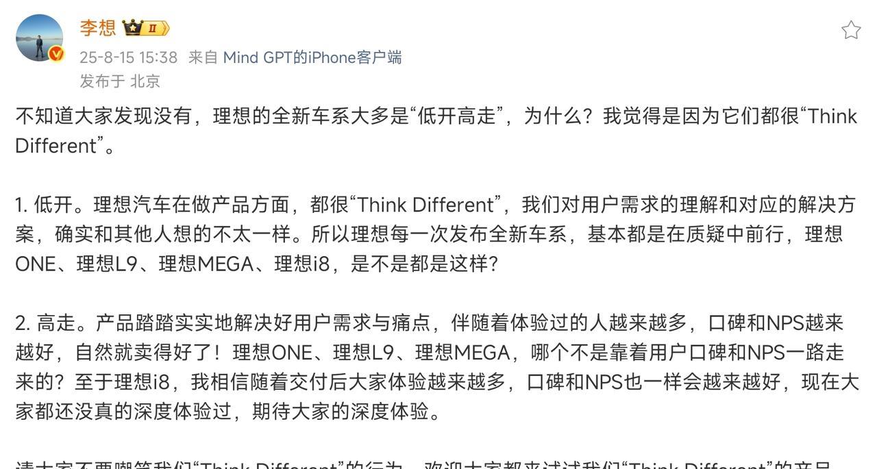 李想在微博里,把理想新车的「低开高走」归结为「ThinkDifferent」