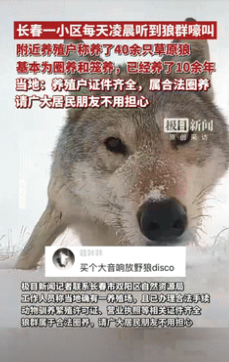 “缺大德了!”吉林长春,一男子每天凌晨都能听到狼群嚎叫,他担心狼群会影响到居民安全,于是报警,谁料,调查后发现,狼群是小区附近养殖户养的,对方证件齐全,属于合法圈养,让众人不用担心,网友:养狼到底能干什么? 据极目新闻8月13日报道,男子住进小区后,常常天不亮就被吵醒了,他不知道声音的来源在哪,但可以肯定是狼发出的声音,即便有困意,也因为害怕而不敢睡了。 被影响的还不止男子一人,吵醒事小,就怕狼群突然冲进小区,思来想去还是决定让相关部门介入,经过走访,还真找到了被圈养的狼群,原来是有人专门饲养的。 养殖户养狼的时间可太长了,他知道不能私自养狼,为了合法化,他专门办理了手续,各种证件办下来可不容易,但养殖户每关都过了,必须确保狼不会伤害到别人,也不会乱跑。 相关部门也证实了,养殖户说的没错,既然要保护住户的合法权益,那养殖户的也不能侵犯,人家在片区域养了许久的狼,总不能让狼群和养殖户集体搬迁吧。 先不说这个现不现实,突然变换环境,对狼群肯定是不利的,不过小区有人居住后,养殖户就打起十二分的精神,约束狼群。 买房对很多人来说是一辈子的事,所以要慎重,买房时要观察下周边环境,但凡有不符合自己心意的,还是得再想想。 对于这件事情,大家有什么看法?