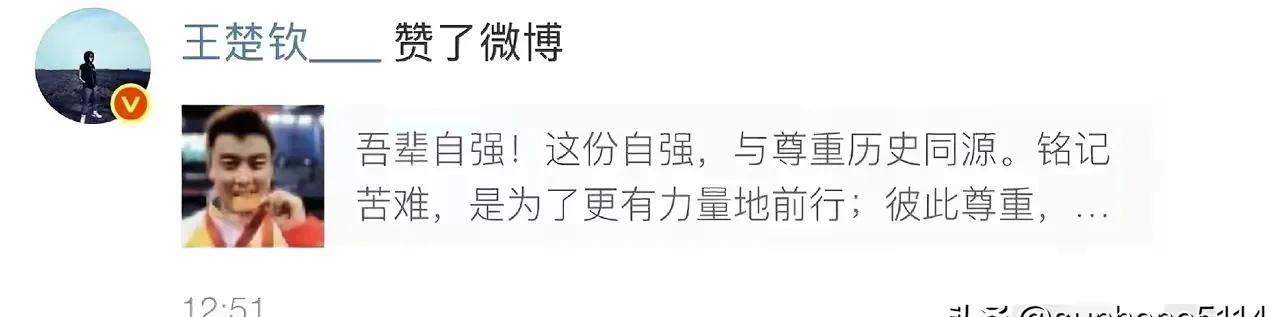 在日本投降纪念日,王皓发帖,王楚钦点赞!吾辈自强,中国人的脊梁,从来没有弯过!