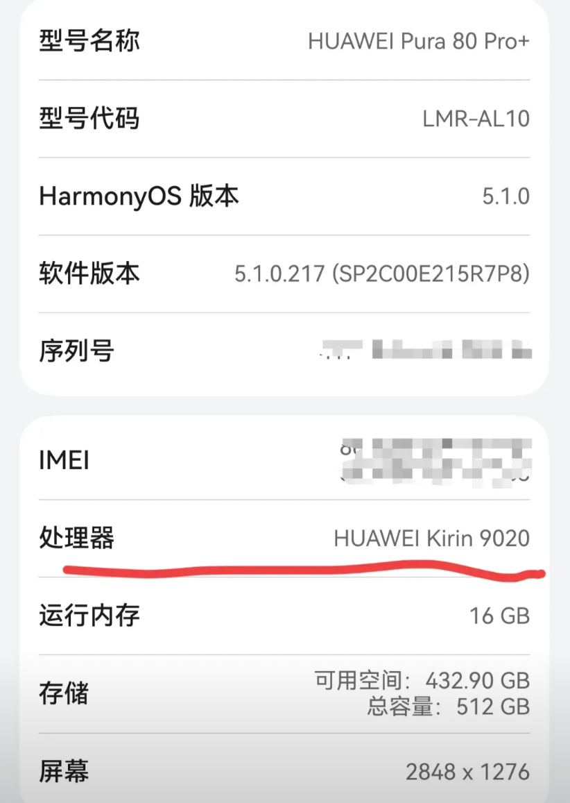 重磅消息,华为Pura80系列在升级到5.1.0.217版本后,在设置界面已经可以【公开】显示处理器型号了(如图)“HUAWEI Kirin 9020”,这个再平常不过的芯片信息标注,对于华为和纯国产芯片而言跨越了太多的艰辛和汗水,内心确实感慨万千!