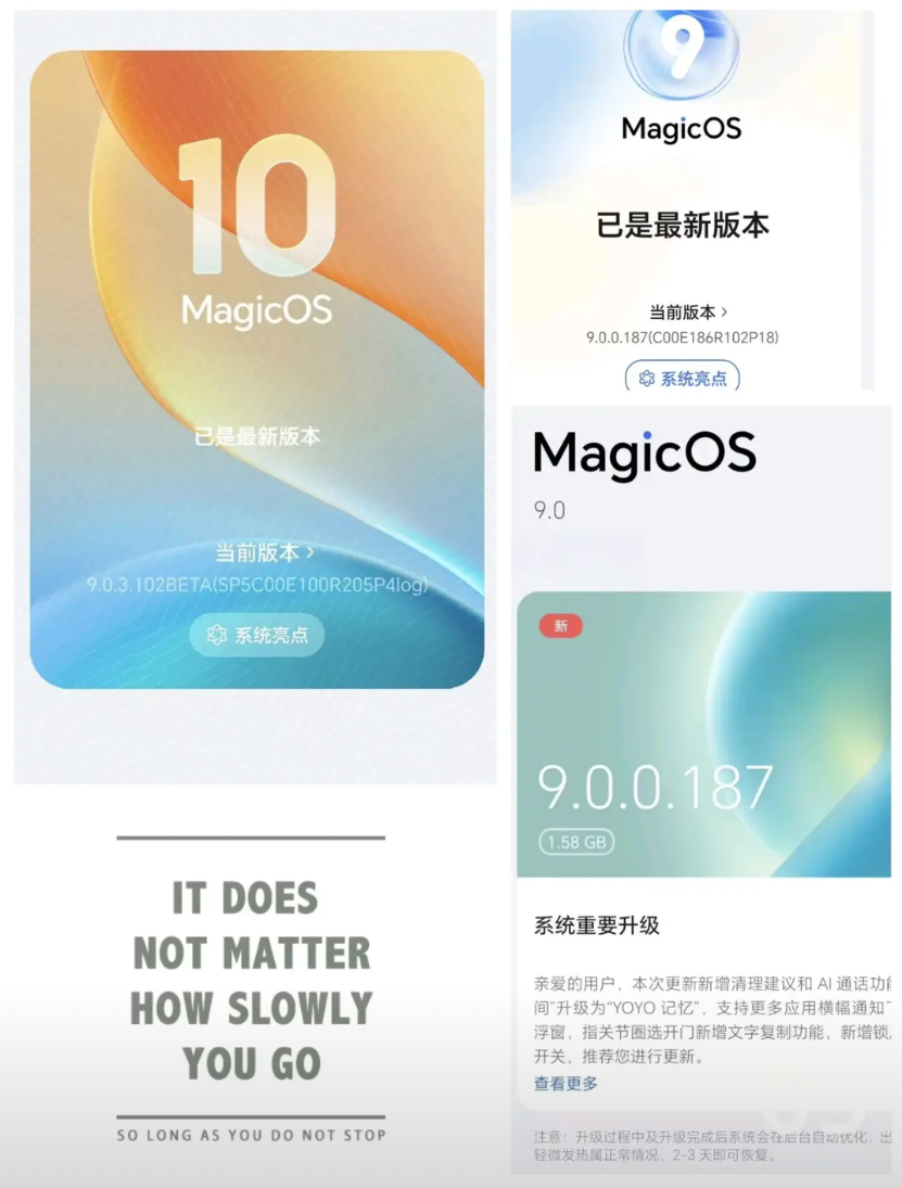 万万没想到!荣耀在这时候竟然还藏着大招,实在是太狠了! 大家都在盼着荣耀MagicOS10的到来,想要体验超越鸿蒙5和ios18的流畅度,还有包括后台堆叠、AI通话等功能。 而对于MagicOS10的发布,最早也要在9月底,却不想在8月份,荣耀给期待MagicOS10的用户提前带来了新功能的体验,那就是Magic7已经推送更新的187版本,共计1.56G的大小,包括AI通话功能等等,属实是让用户能够提前感受到MagicOS10的新功能体验啊! 不得不说,这一次187版本的更新,确实是出乎了很多人的意料啊!