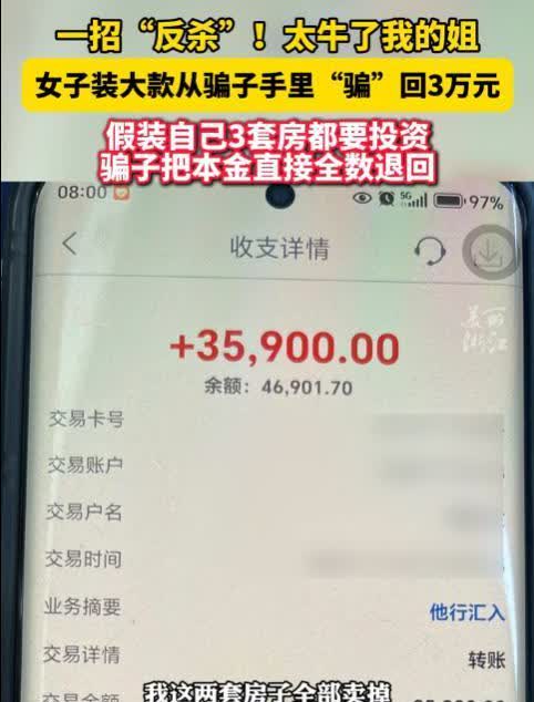 电视剧都不敢这么演!浙江,一女子被炒股培训群骗走3万多元,气不过的她决定反击,便假扮“白富美”,不仅谎称上市公司老总的女儿,还表示要投资几百万元!没想到骗子信以为真,随后女子提出考验,最终拿回了被骗的3万元!而警方对此事的回应让人意想不到! 现在这个网络骗子手段多得很,浙江嘉兴有个叫小红的姑娘,就因为加入了一个炒股培训群,一个月不到就被骗走了3万多块钱。发现自己上当后,小红赶紧报了警。警察建议她先别惊动骗子,于是小红脑筋一转,想了个妙招——反过来骗骗子! 她装成了一个超级有钱的白富美,跟骗子说自己是大老板的女儿,房子好几套,手里还有好几百万等着投资呢,甚至说要抵押房子多投点。骗子一听,眼睛都亮了,真以为遇到了大鱼。 小红看骗子上钩了,就说要考验考验他们,让他们先把之前被骗的钱退回来,这样她才放心合作。骗子为了拉拢这个大客户,二话不说就把35900元打了回来。钱一到账,小红立马翻脸不认人,跟骗子说了句“钱收到了,拜拜”,然后把对方拉黑了。骗子这时候才恍然大悟,但已经太晚了。 小红追回钱后,高高兴兴地告诉了警察,但警察却没夸她,反而提醒她这样做太冒险了,反诈骗还是应该靠法律手段。虽然小红的故事结局挺好,但风险实在太大,大家可别学着干。