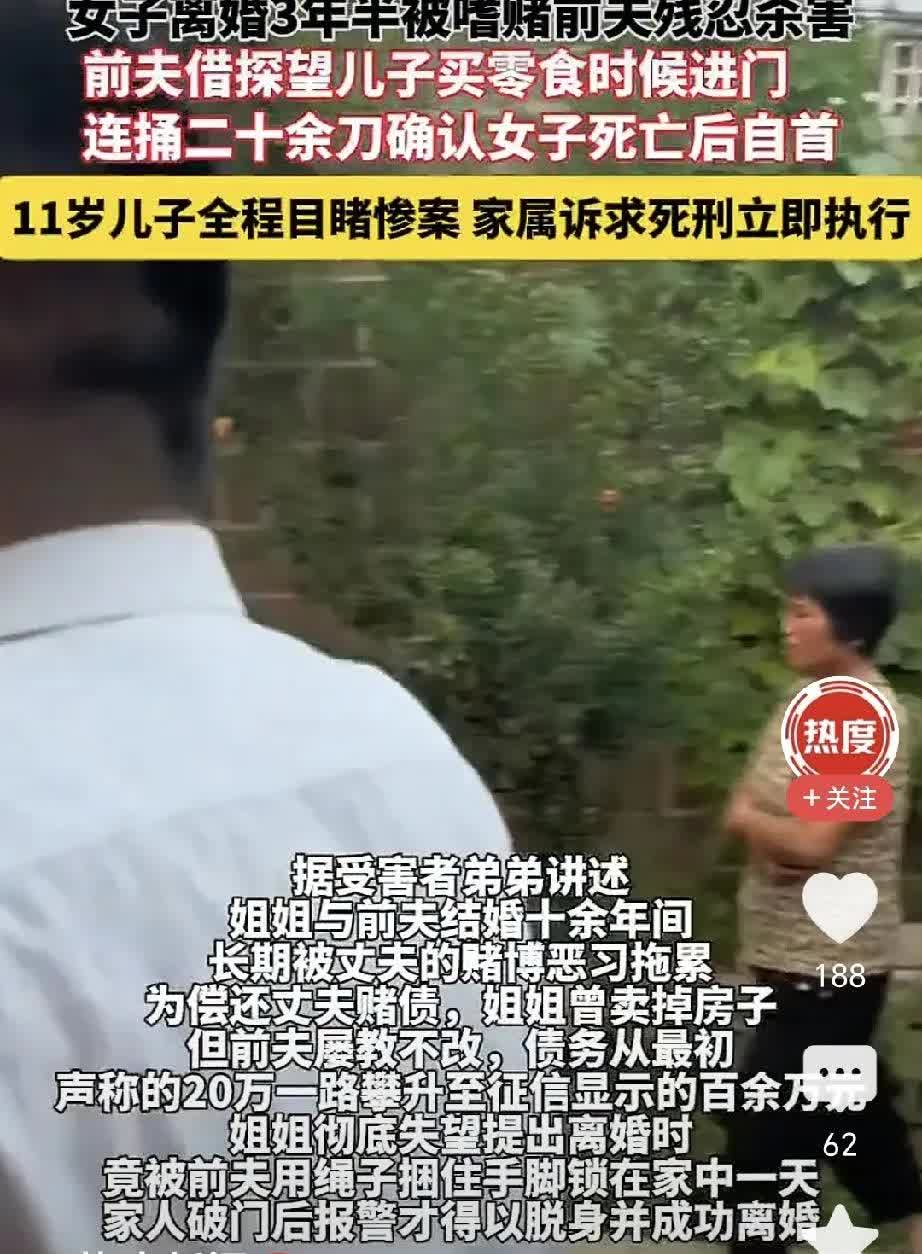 赌徒父亲当着11岁儿子的面,杀死孩子的好妈妈!而这位妈妈已经与这个凶手离婚三年半。难怪受害者家属表示:我们不要赔偿,只希望他为自己的罪行赎罪,让我们能尽快带着孩子走出阴影,开启新生活。 事发山东临沂,女子与前夫结婚十余年,丈夫始终不改赌博恶习,为偿还债务,女子卖掉了家里的房子。即使这样,男子仍然屡教不改,赌债多达一百多万。女子对丈夫彻底失望,提出离婚。丈夫为了阻止离婚,竟然捆绑住女子手脚锁在家里。直到女子家人得知后破门而入,然后报警才得以脱身并成功离婚。 离婚后的女人独立支撑家庭,有时候一天打两份工,每天工作十三四个小时。挣钱养家 ,照顾孩子,辅导孩子作业……三年多了,女子终于通过相亲找到了新的另一半,生活出现了曙光。 不幸的是,虽然离婚三年半,但是女子并没有彻底摆脱赌徒前夫这个魔鬼。8月10日,前夫借探望儿子为名,先带孩子买零食,回家后将女子拖至卧室,当着11岁儿子的面,连捅女子二十余刀直到女子死亡。行凶后还阻止儿子报警,确认前妻死亡后才去自首。 一个男人,不能承担起家庭责任,染上恶习债台高筑,弄得妻儿无立锥之地仍不知悔改,还有什么脸面拖累妻儿?离婚之后,妻儿的生活好不容易有了一线希望,不知道为什么自己不想活了,还要拉前妻垫背。他的所作所为,让儿子一生都抹不去那沉重的阴影,也让孩子一想起这个赌徒父亲就咬牙切齿。 活着,拖累家人,危害社会。自己不想活了,也要拉别人垫背,给亲人留下沉重的阴影。因此,被害者家属唯一的诉求:依法判处犯罪嫌疑人死刑,立即执行。