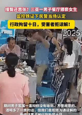 太嚣张了!海南三亚一家餐厅里,一女子在打蘸料时,被身后男子摸了一下屁股,女子质问男子为何摸她,男子称不是故意的,随后双方发生争执,女子报警,警察调取监控视频后认定该男子是故意猥亵女子,对他做出行政拘留10日处罚。 就这么蹭了一下,关十天,档案留下污点,这个男人图啥?还是自身不检点。占小便宜的下场 这油腻中年大叔也太无聊了,莫一下女人的屁股就舒服吗?应该受到处罚。 这个动作,完全想心存饶幸占便宜。帽子叔叔处理完全正确,对公共场所的行为举止,就是必须严苛责任。