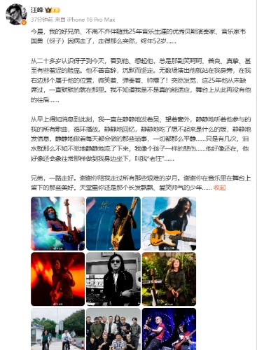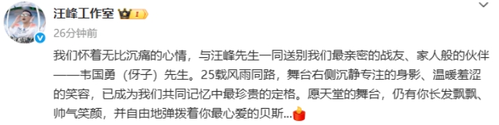 汪峰发文悼念:今晨,我的好兄弟走了 “今晨,我的好兄弟、不离不弃伴随我25年音乐生涯的优秀贝斯演奏家、音乐家韦国勇(伢子)因病走了,走得那么突然,终年52岁……”8月15日,汪峰在微博中发出长文。 图据汪峰微博 汪峰称他和韦国勇在20多岁时相识,韦国勇善良、真挚、羞涩,不善言辞,沉默而坚定。 “无数场演出他就站在我身旁,在我右边那个属于他的位置,微笑着、弹奏着、帅爆了!突然发觉,这25年他从未缺席过,一直默默地就在那里。我不知道我是不是真的能适应,舞台上从此再没有他的往后。”汪峰写道,从早上得知这一消息后,他一直在静静地发呆、望着窗外,静静地听着他参与的所有歌曲,循环播放:“只是有几次,泪水就那么不知不觉地静静地流了下来,我像个孩子一样的悲伤……他好像还在,他好像还会像往常那样到我身边坐下,叫我‘老汪’。” 图据汪峰微博 随后,汪峰工作室转发称:我们怀着无比沉痛的心情,与汪峰先生一同送别我们最亲密的战友、家人般的伙伴——韦国勇(伢子)先生。25载风雨同路,舞台右侧沉静专注的身影、温暖羞涩的笑容,已成为我们共同记忆中最珍贵的定格。愿天堂的舞台,仍有你长发飘飘、帅气笑颜,并自由地弹拨着你最心爱的贝斯... 网友悼念:太突然 来源:红星新闻综合 报料、维权通道:应用市场下载“晨视频”客户端,搜索“报料”一键直达;或拨打热线0731-85571188。如需内容合作,请拨打政企服务专席19176699651。