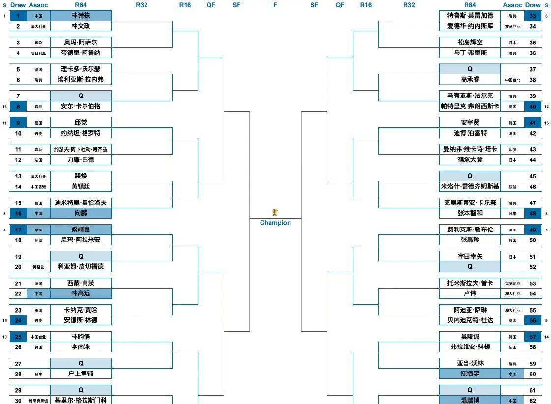 男单选手签位! WTT欧洲大满贯瑞典站男单签位如图。 这一次林昀儒远离了林诗栋,但还不是很远啊[捂脸]。 大胖、石头、高远、向鹏都拥挤在了上半区,确实不好,不过强手如小勒布伦、莫雷加德、张本智和全在下半区撕扯,这也不错[奸笑]!