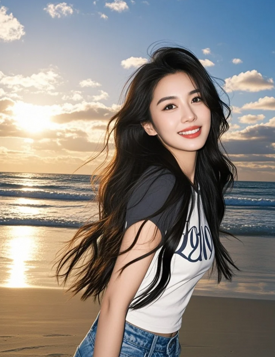 蓝天为幕,白云作伴,她身着简约T恤,以亲和笑容点亮了整片金色海岸线