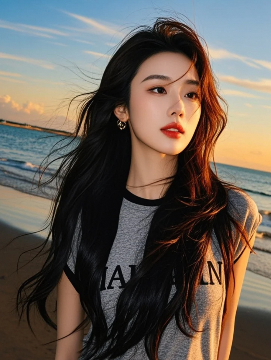 夕阳熔金,长发在海风中起舞,她漫步沙滩,每一步都踏出大牌明星的从容气场