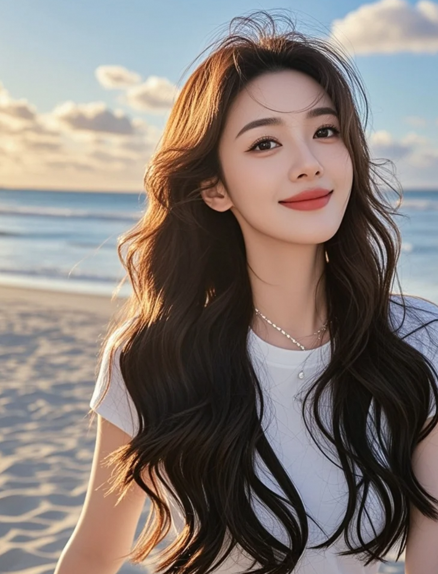 蓝天为幕,白云作伴,她身着简约T恤,以亲和笑容点亮了整片金色海岸线