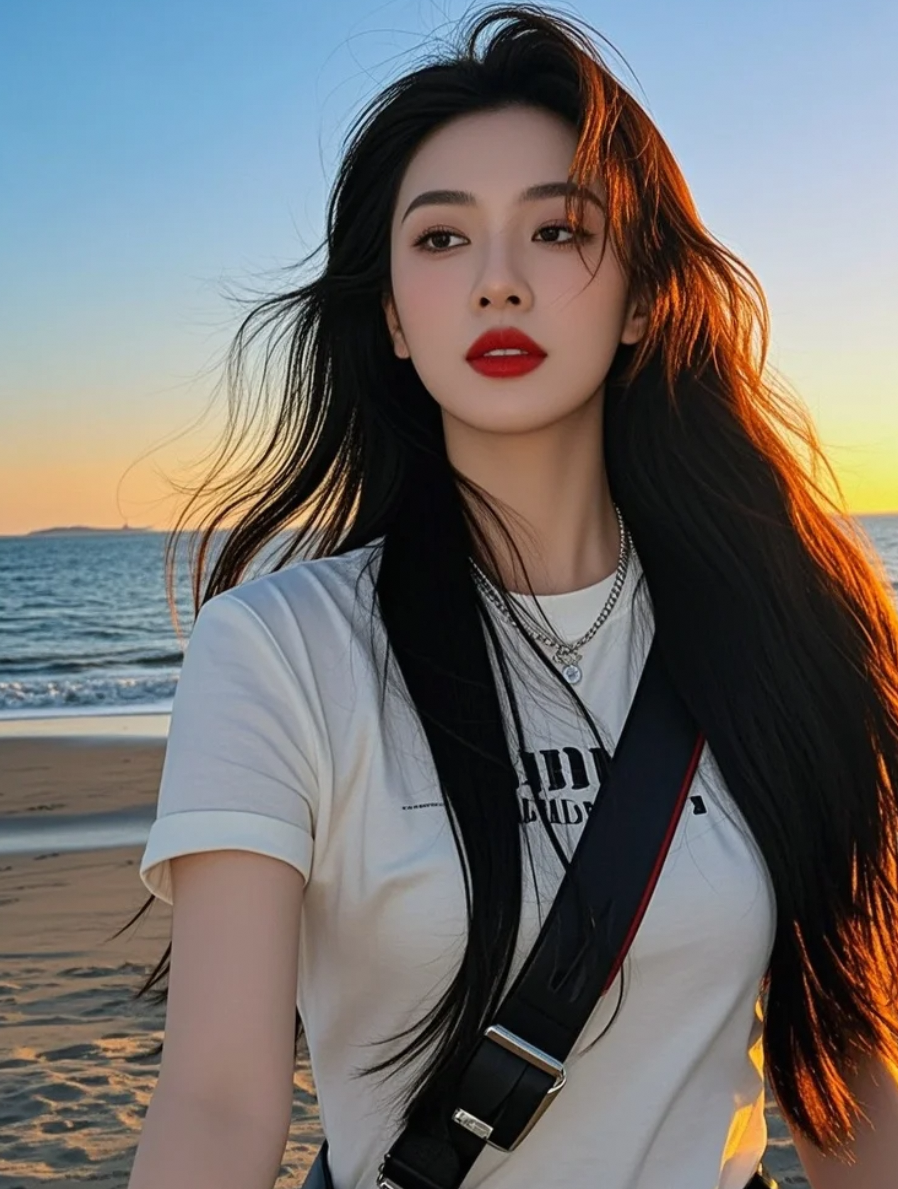 夕阳熔金,长发在海风中起舞,她漫步沙滩,每一步都踏出大牌明星的从容气场