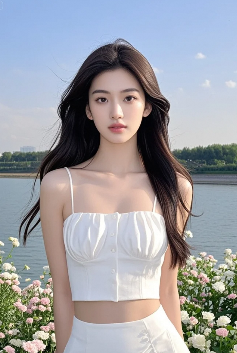 江风卷起她的发丝,花影落在她的肩头