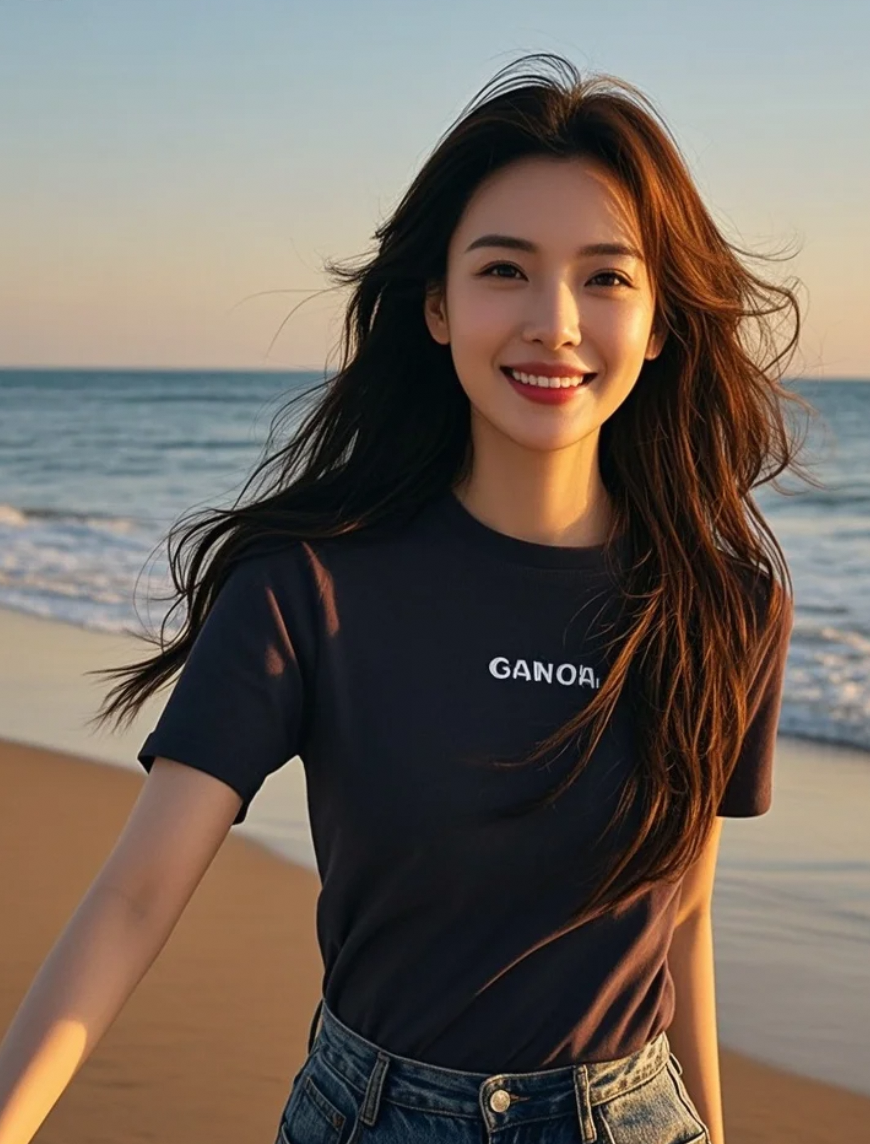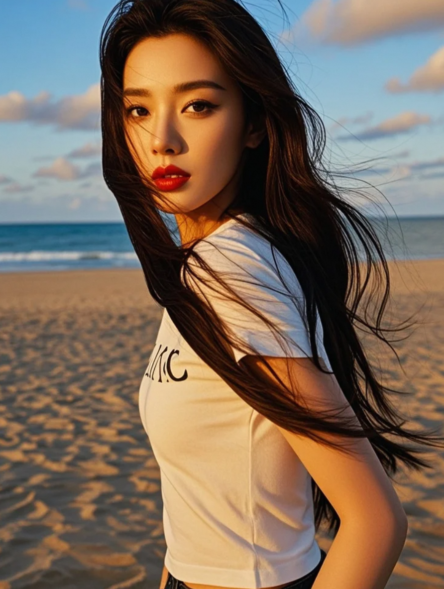 蓝天为幕,白云作伴,她身着简约T恤,以亲和笑容点亮了整片金色海岸线