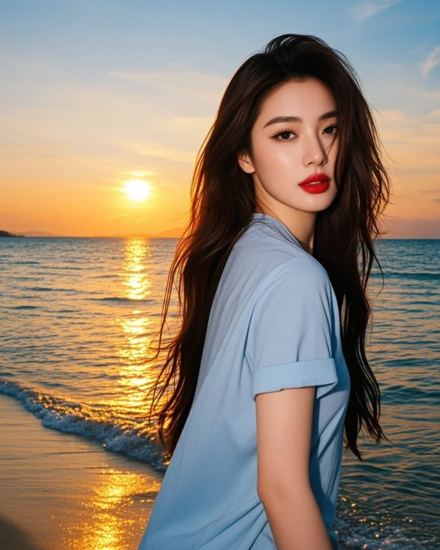 在落日熔金的时刻,她以长发为笔,沙滩为纸,书写着星光熠熠的亲和篇章