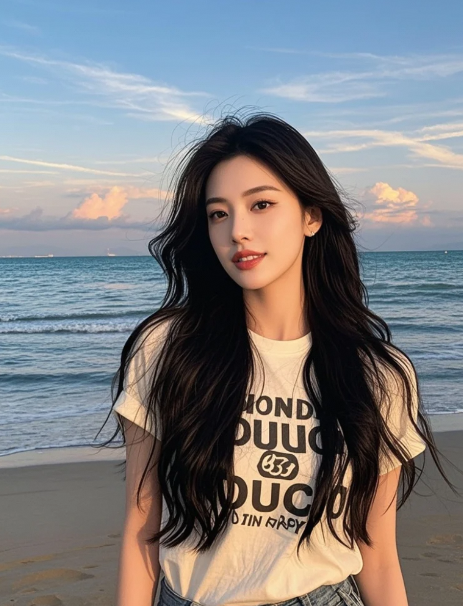 在落日熔金的时刻,她以长发为笔,沙滩为纸,书写着星光熠熠的亲和篇章