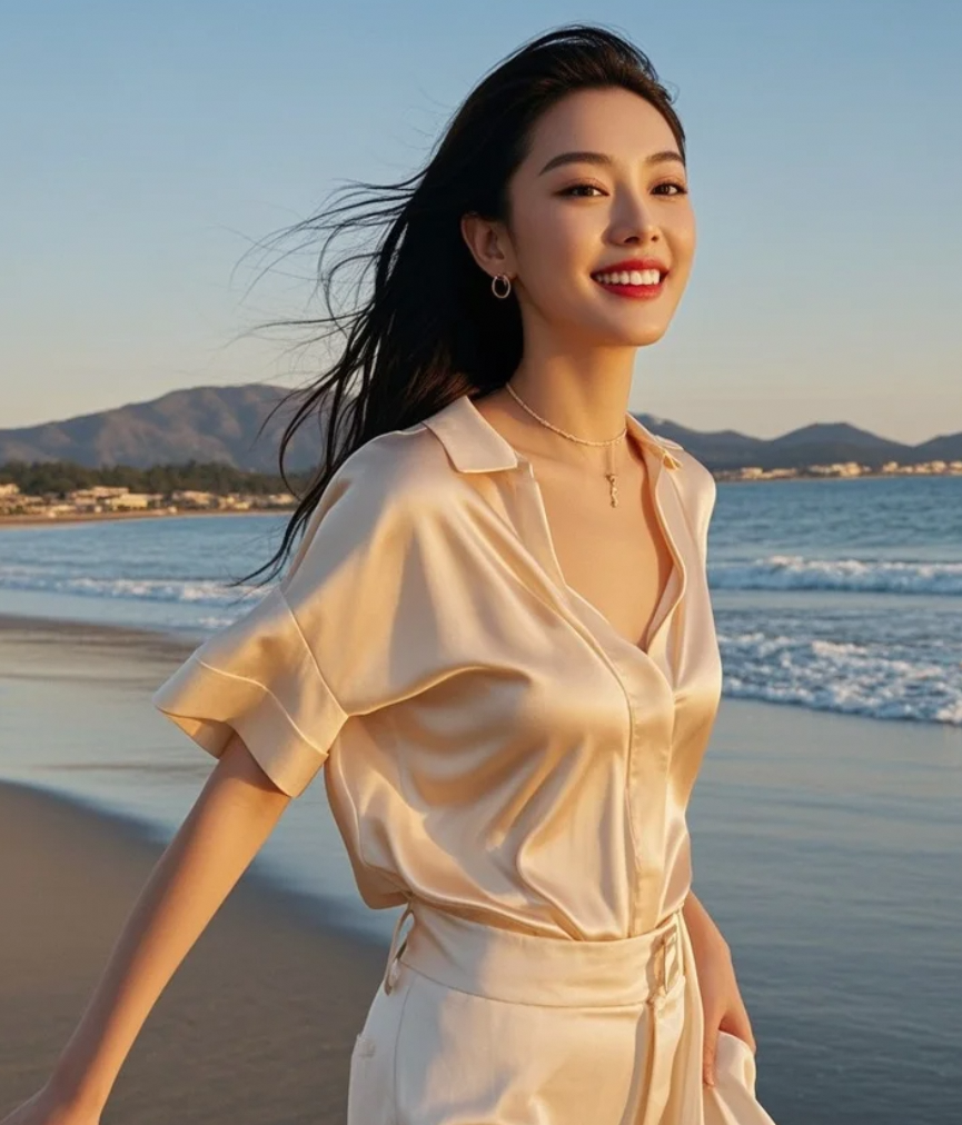 夕阳为她加冕,她行走在金色沙滩,以亲和笑容与活力姿态征服每一寸海岸
