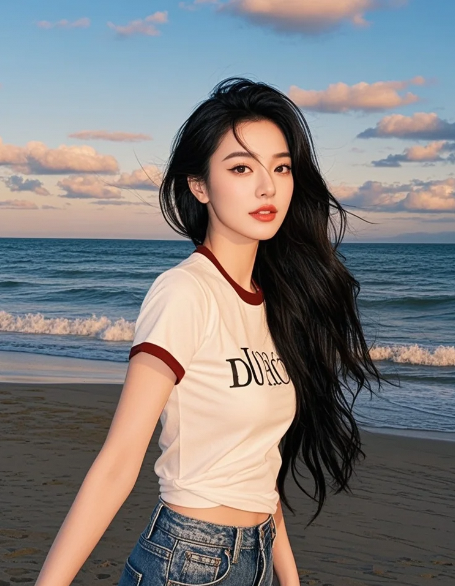 在金色的沙滩上,她如一幅流动的画卷,长发、T恤与海风共谱星光乐章