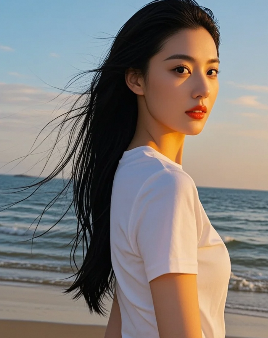 她的身影与晚霞交融,长发飘飘,是海风中最动人的阳光亲和巨星画面