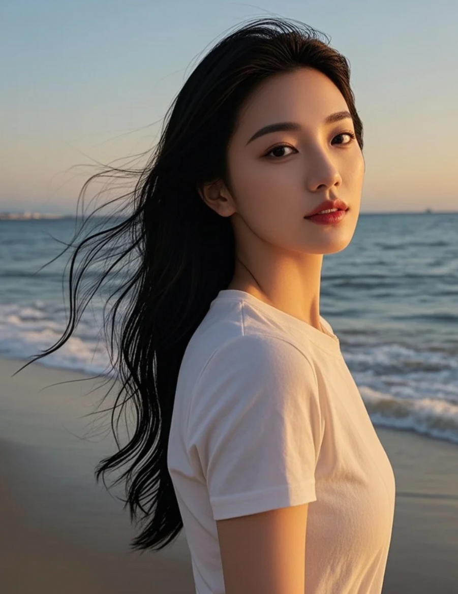 她的身影与晚霞交融,长发飘飘,是海风中最动人的阳光亲和巨星画面