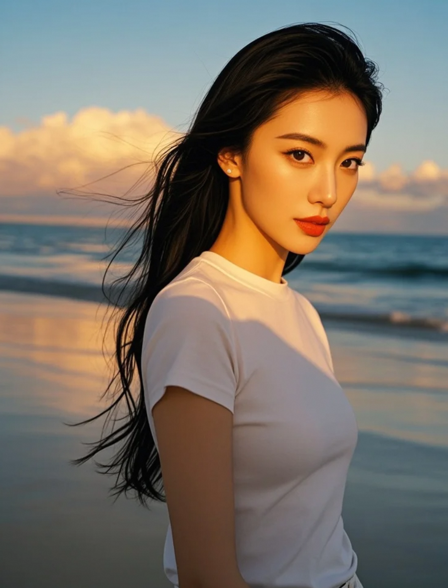 她漫步在海天之间,长发与云影共舞,明艳唇色点亮了黄昏的静谧时光