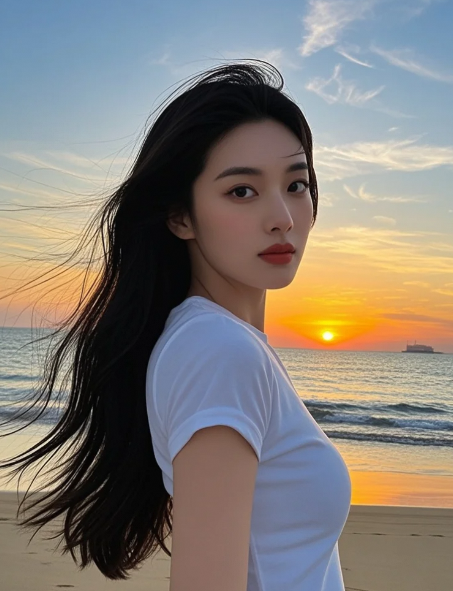 她的身影与晚霞交融,长发飘飘,是海风中最动人的阳光亲和巨星画面