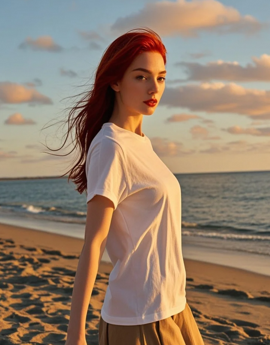 在落日熔金的时刻,她以长发为笔,沙滩为纸,书写着星光熠熠的亲和篇章