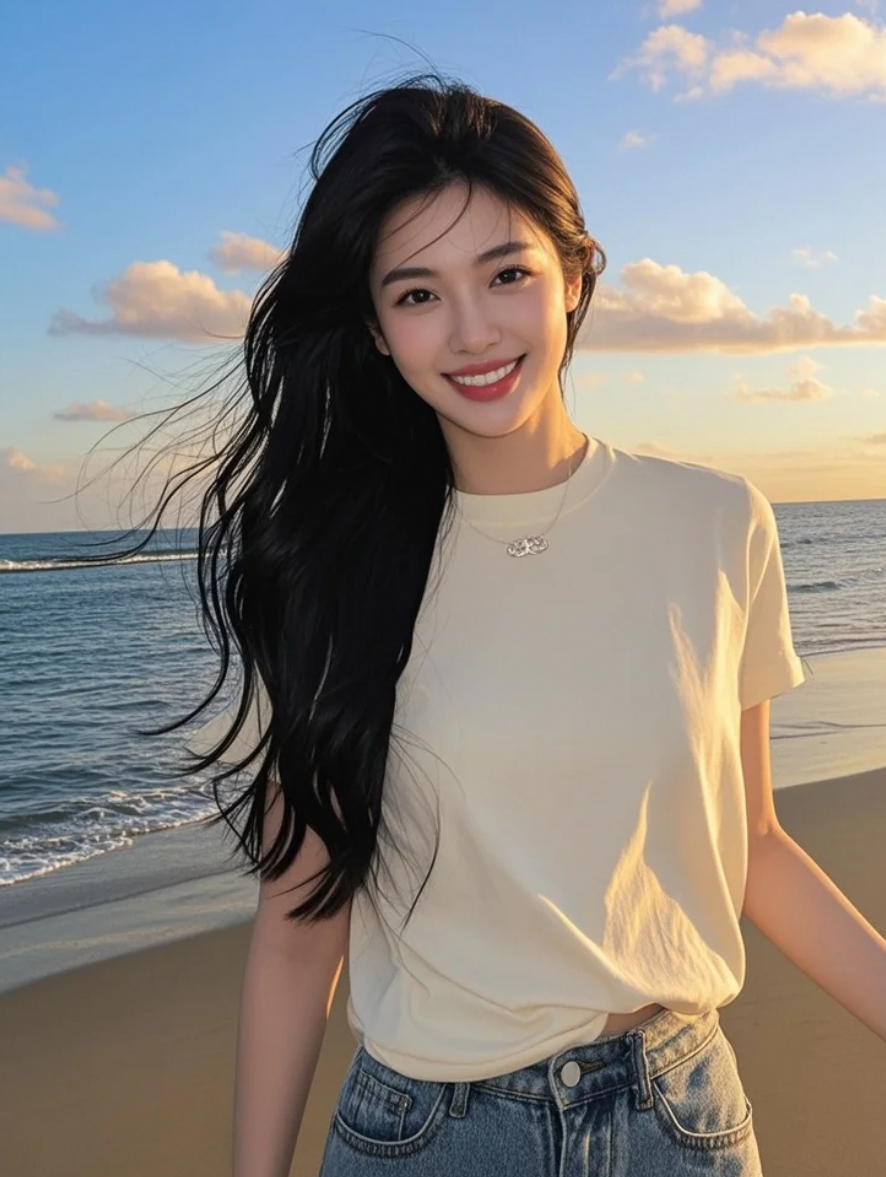 在落日熔金的时刻,她以长发为笔,沙滩为纸,书写着星光熠熠的亲和篇章