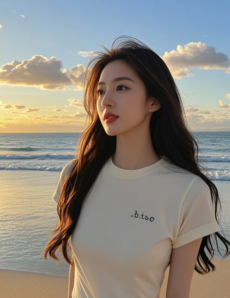 蓝天为证,她漫步沙滩,T恤简约却气场全开,是落日下最动人的星光风景