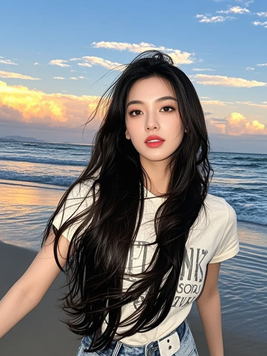夕阳熔金,长发在海风中起舞,她漫步沙滩,每一步都踏出大牌明星的从容气场