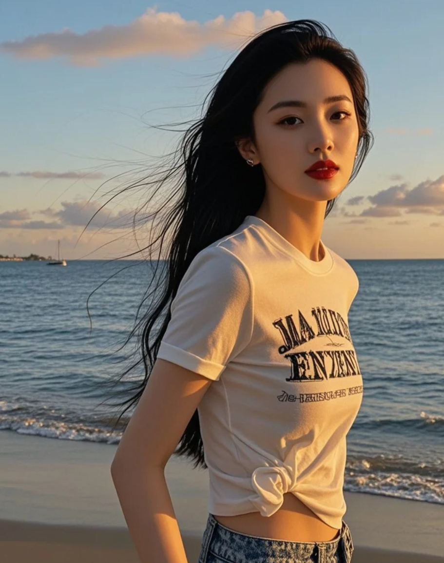 蓝天为幕,白云作伴,她身着简约T恤,以亲和笑容点亮了整片金色海岸线