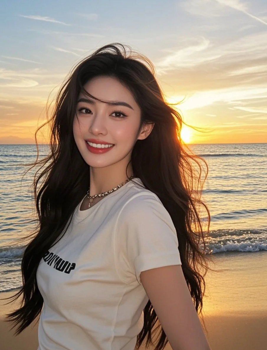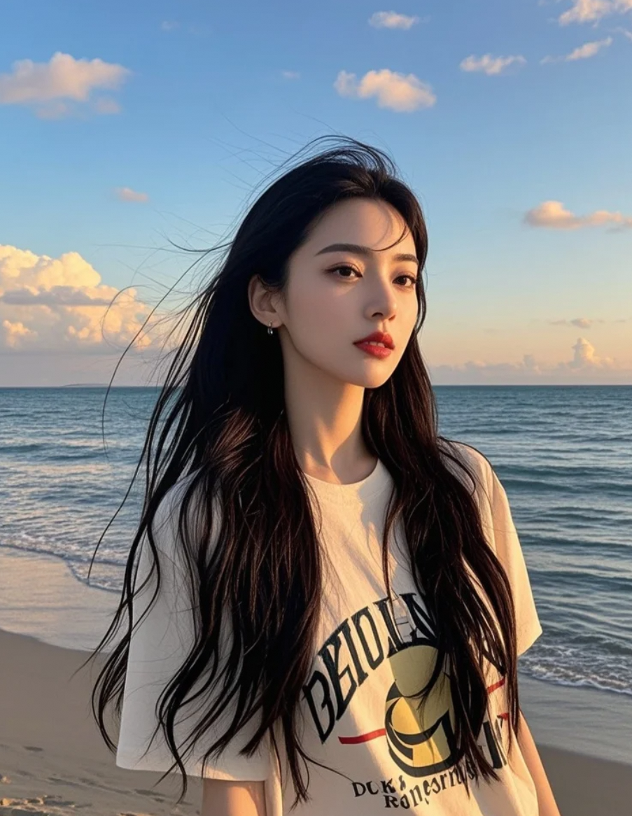 白云为她铺路,她身着T恤,以亲和笑容与飞扬发丝,点亮黄昏的沙滩
