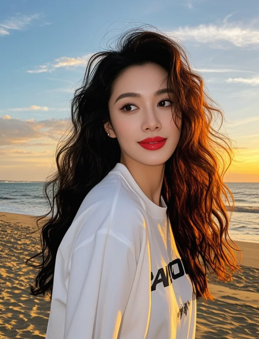 在落日熔金的时刻,她以长发为笔,沙滩为纸,书写着星光熠熠的亲和篇章