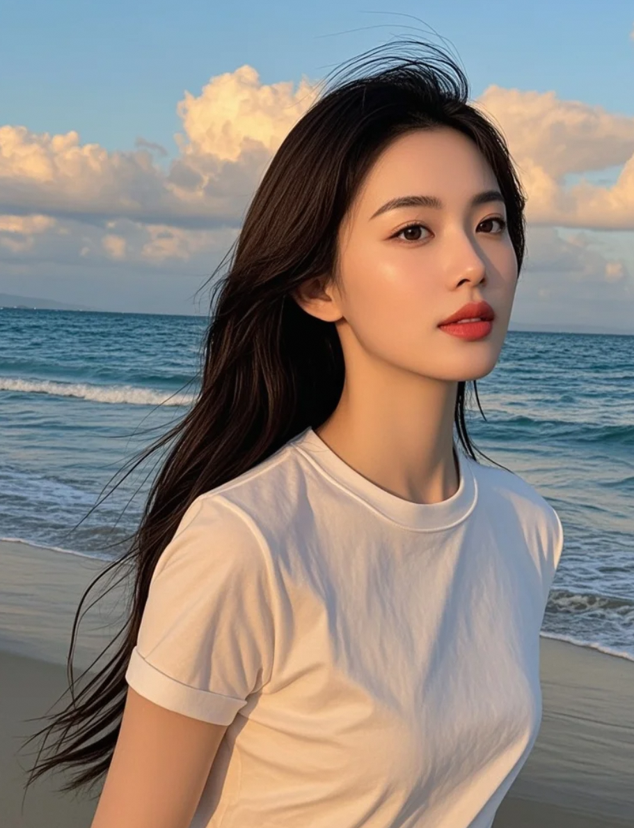她漫步在海天之间,长发与云影共舞,明艳唇色点亮了黄昏的静谧时光