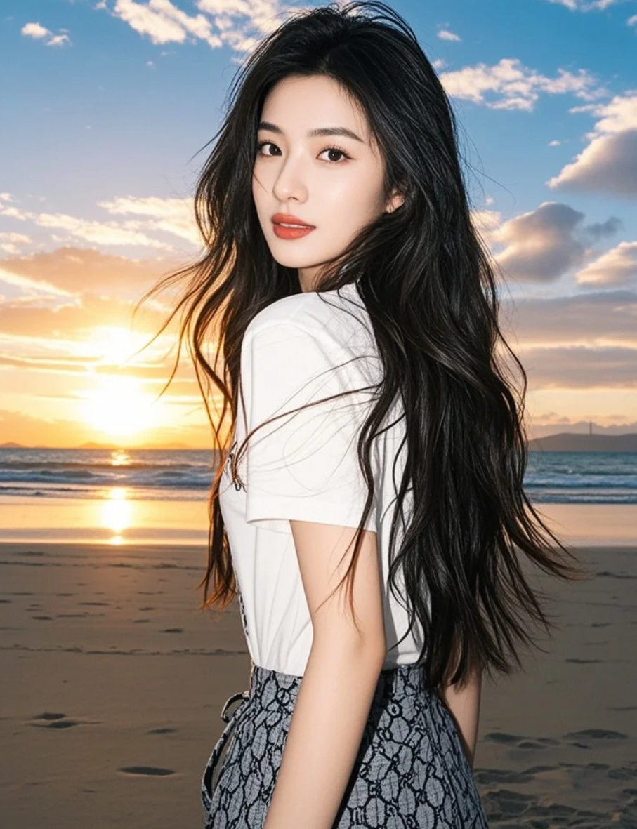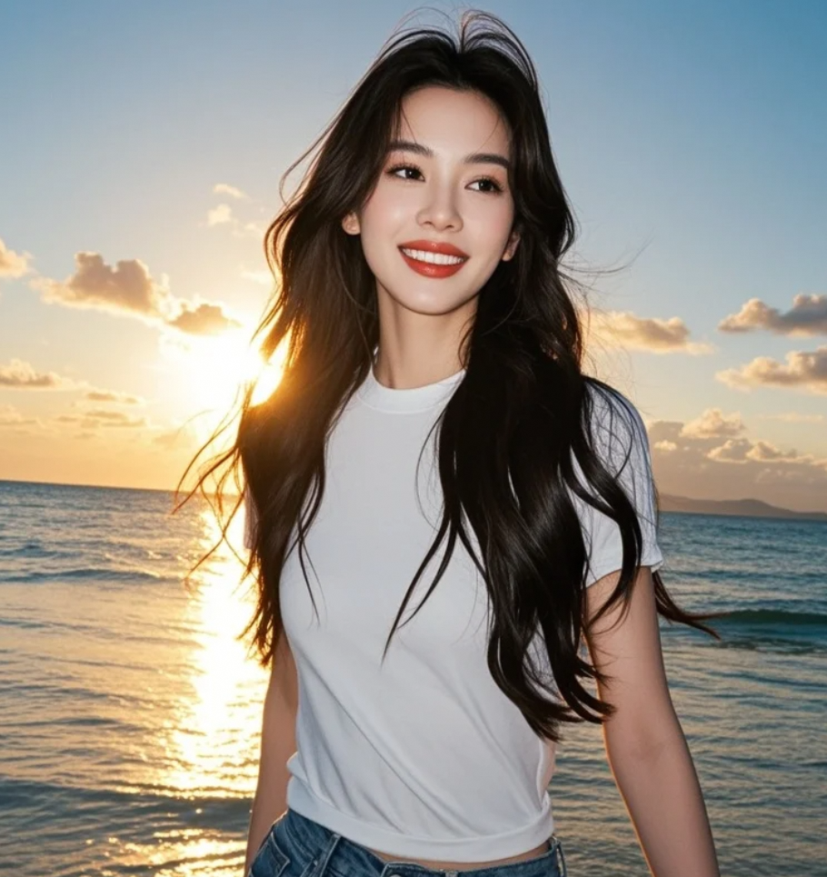 她的身影与晚霞交融,长发飘飘,是海风中最动人的阳光亲和巨星画面