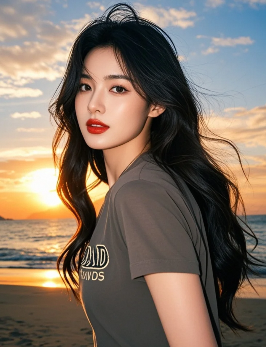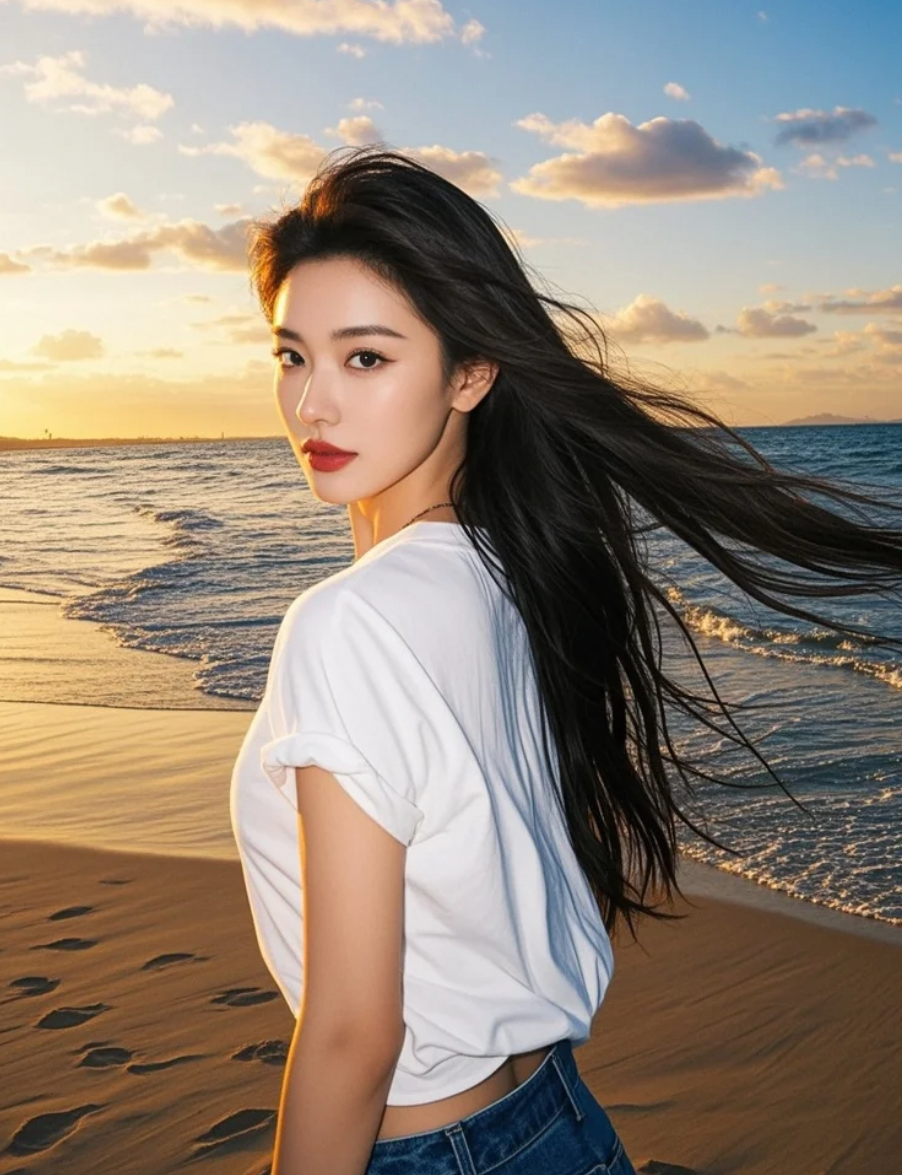 她的身影与晚霞交融,长发飘飘,是海风中最动人的阳光亲和巨星画面