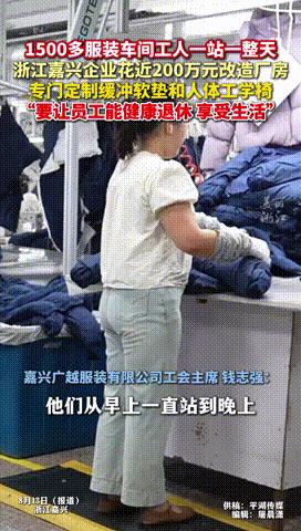 “简直是良心企业!”浙江嘉兴,一服装企业心疼工人一站一整天,便豪掷200万改造厂房,特地定制缓冲软垫和人体工学座椅!在被媒体报道以后,老板的一番话更是让人点赞!网友:这就是好老板啊,活该发大财! “我们宁愿牺牲效率,也得让员工健康退休享受生活。” 浙江嘉兴广越服装有限公司的老板面对采访时坚定地说道。 从前,服装车间的工位旁,摆的是清一色硬邦邦的长板凳:左边摞着辅料,右边堆着半成品,工人坐下时,后腰只能“悬空战斗”。 工会主席钱志强最心疼这个细节:“好多老工人腰肌劳损,疼得直不起身,还得咬着牙赶工。” 如今,厂里把这些硬板凳全换成了定制人体工学椅。 因为这种椅子的椅背弧度刚好贴合腰椎曲线,扶手能前后调节,甚至连坐垫的软硬度都经过测试,工人试坐时,有个大姐摸着椅背笑说:“这椅子像长了眼睛,把我后腰那股子酸劲全‘吸’走了!” 车间里1500多名工人,大半时间都是“站着干活”。从前踩水泥地,膝盖和脚弓被压得生疼,有人悄悄在鞋里塞棉花,也挡不住一天下来的酸胀。 这次改造,企业把所有站立工位都铺上了黑色缓冲软垫,这些垫子看着普通,但厚度是经过力学计算,人踩上去会微微下陷,像踩进海绵里,把身体重量均匀分散到整个脚掌。 现在,工位旁的软垫上,常能看到工人午休时脱鞋放松,这是他们从前想都不敢想的“待遇”。 除了“撑腰”“护脚”,企业连“照亮”都抠到了极致,从前车间灯光要么昏暗发黄,要么亮得刺眼,工人缝针时总得眯着眼找线头,干久了眼睛又酸又胀。 这次改造,技术人员带着仪器反复调试,把灯光亮度、色温都拧到“工作时最舒服的状态”:现在车间里光线均匀柔和,布料上的针脚清晰透亮,连布料纹路里的灰尘都看得真切。 改造后,车间里的变化藏在每个细节里:踩软垫的工人脚步更稳,坐工学椅的工人腰杆更直,在柔和灯光下,连缝纫机的“哒哒”声都似乎轻快了几分。 虽说改造让生产节奏稍慢,但老板半点不慌:“效率能追回来,工人的健康可追不回来。” 这事被媒体曝光后,网友评论直接“炸锅”: 有人翻出自己公司“硬板凳+刺眼灯”的办公环境,酸溜溜留言“求老板来嘉兴进修”; 还有人点赞“这才是企业该有的样子,把员工当人看,活该发财!” 更有老工人家属动情分享:“我爸在服装厂干了三十年,要是早遇上这样的厂,退休后也能好好逛公园了……” 在“速度为王”的当下,这家嘉兴企业用“把人放在第一位”的朴素逻辑,花200万改造费,改的不只是厂房硬件,更是把“尊重”二字,实实在在砸进了每个工位的细节里。 当老板说“让员工健康退休”时,藏着最动人的承诺:企业和员工,本就是一群人相互托举、并肩前行的同行者。 那么你们怎么看待这些事呢?欢迎在评论区说说你们的看法吧! 信源:美丽浙江