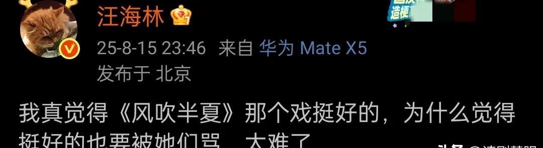 编剧汪海林做梦都想不到,夸赞杨幂的《生万物》,竟然惹了一身麻烦。 看了几集《生万物》,汪海林发文对其大加赞美,对各位演员也给予肯定,没想到因为提了一句《花开半夏》,评论区炸锅了。 很多网友不满汪海林在夸赞《生万物》时提《风吹半夏》,觉得他这样是在蹭流量。 尽管汪海林一再解释没有说《风吹半夏》不好,但有些网友就是不买账,这让他觉得非常委屈。 个人觉得,有位网友的评论直击要害,道出了问题所在。 那就是如果他分开夸两部剧,那两家粉丝都会很开心。